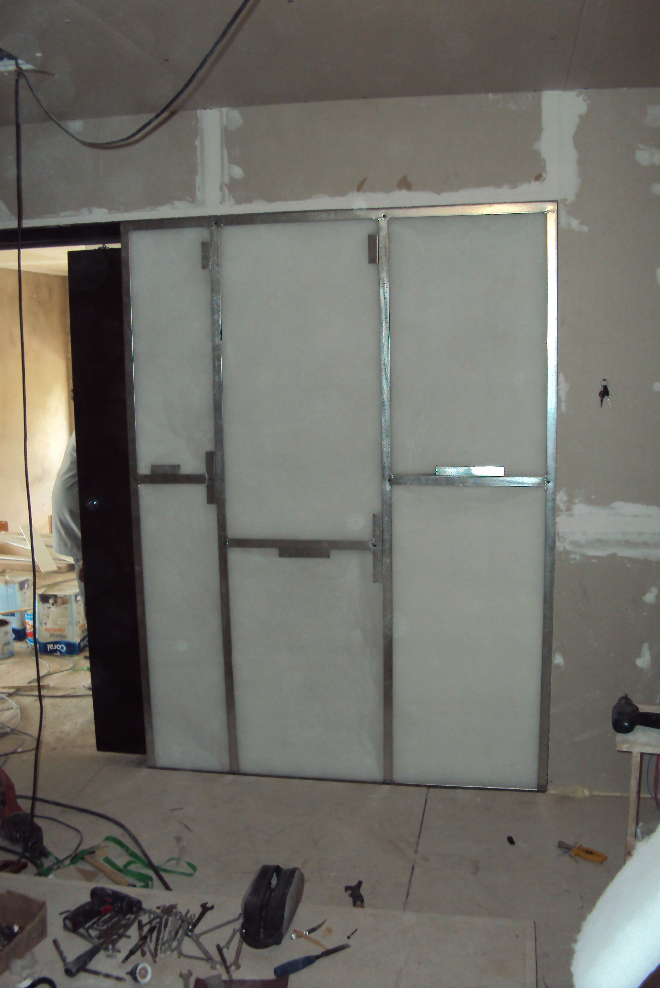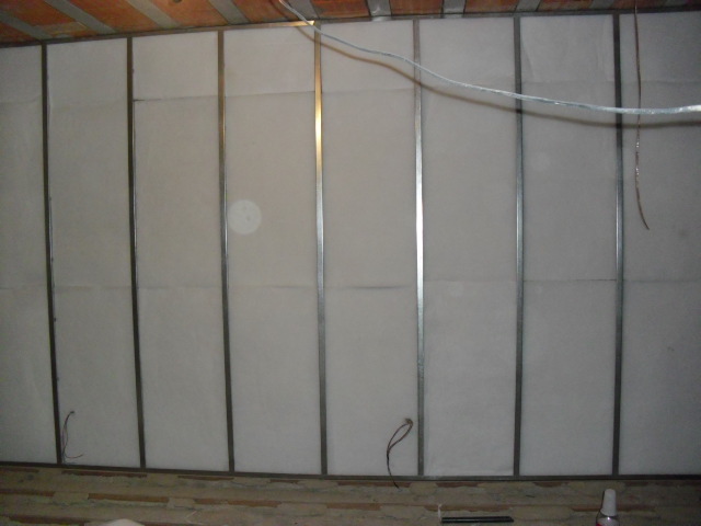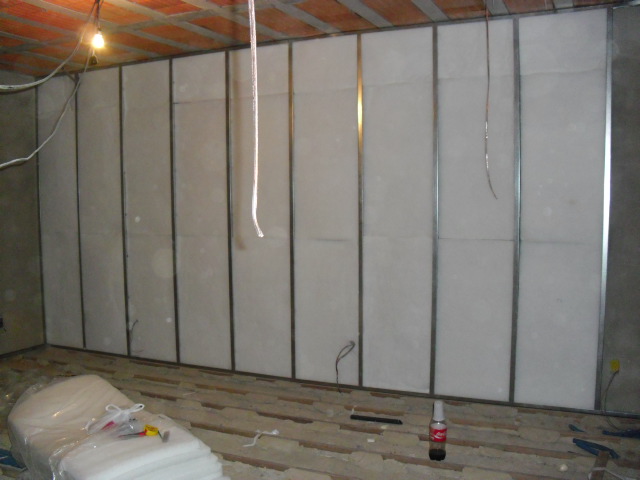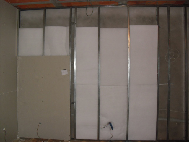 A Divisória de Drywall pode ser executada como reforço isolante acústico para parede já existente, sendo feita paralela a mesma, constituída de dupla camada sobreposta de painel de gesso acartonado intercalados com manta flexível isolante, miolo em painel de lã de rocha 2", perfis estruturais metálicos, com espessura total do revestimento de 80mm.